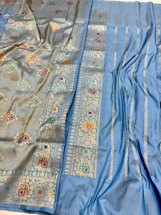Sky Blue Handloom Pure Banarasi Katan by Katan Silk Saree