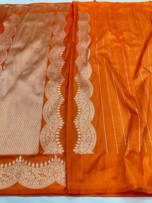 Orange stripes Scallop border Designer Handloom Banarasi Katan by Katan Silk Saree