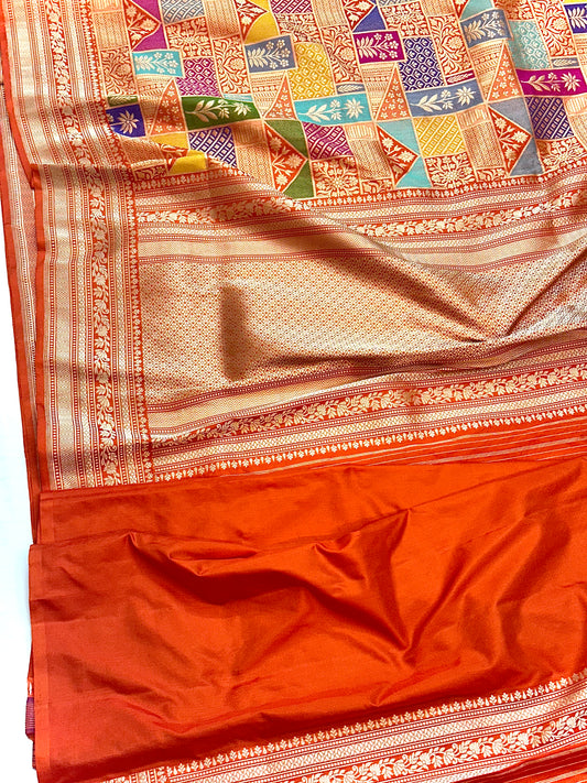 Orange Designer Handloom Banarasi Katan by Katan Silk Saree
