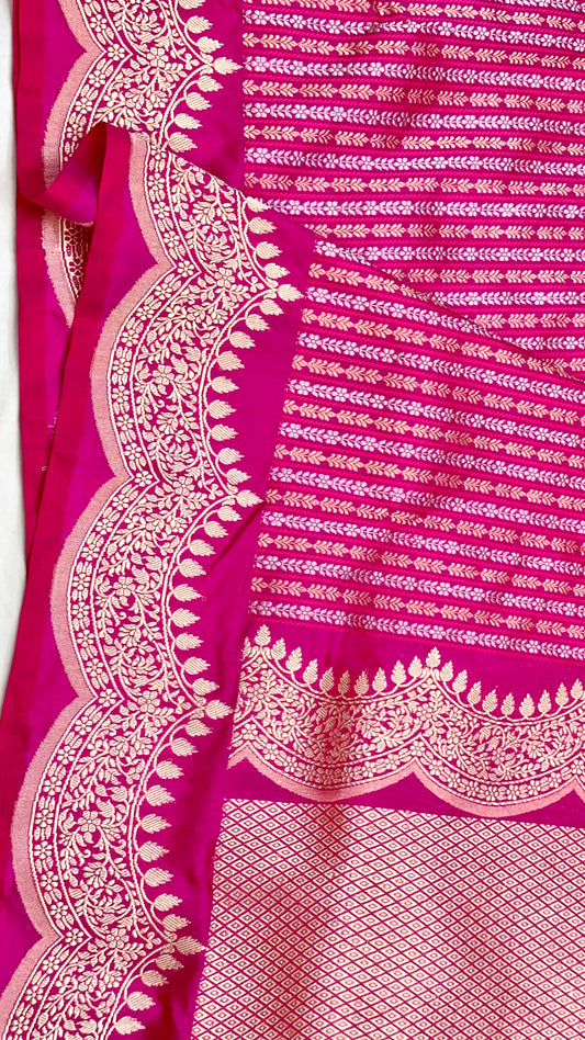 Rani Pink Stripes Scallop border Designer Handloom Banarasi Katan by Katan Silk Saree